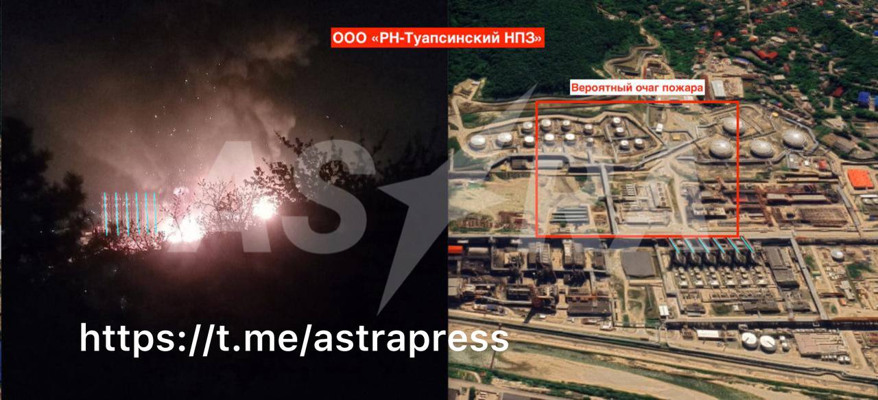 Оновлено: Пізніше російський Telegram-канал Astra повідомив, що згідно з його аналізом відеозаписів очевидців, внаслідок атаки дійсно горить Туапсинський НПЗ.