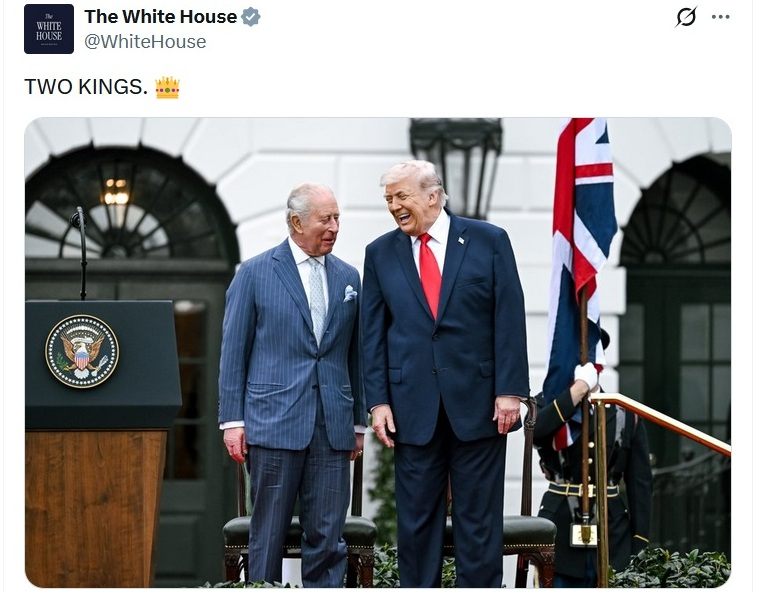 Офіційний акаунт Білого дому в мережі X опублікував фото зустрічі президента США Дональда Трампа і короля Британії Чарльза III, що відбулася у вівторок у Вашингтоні, підписавши його "Два королі".