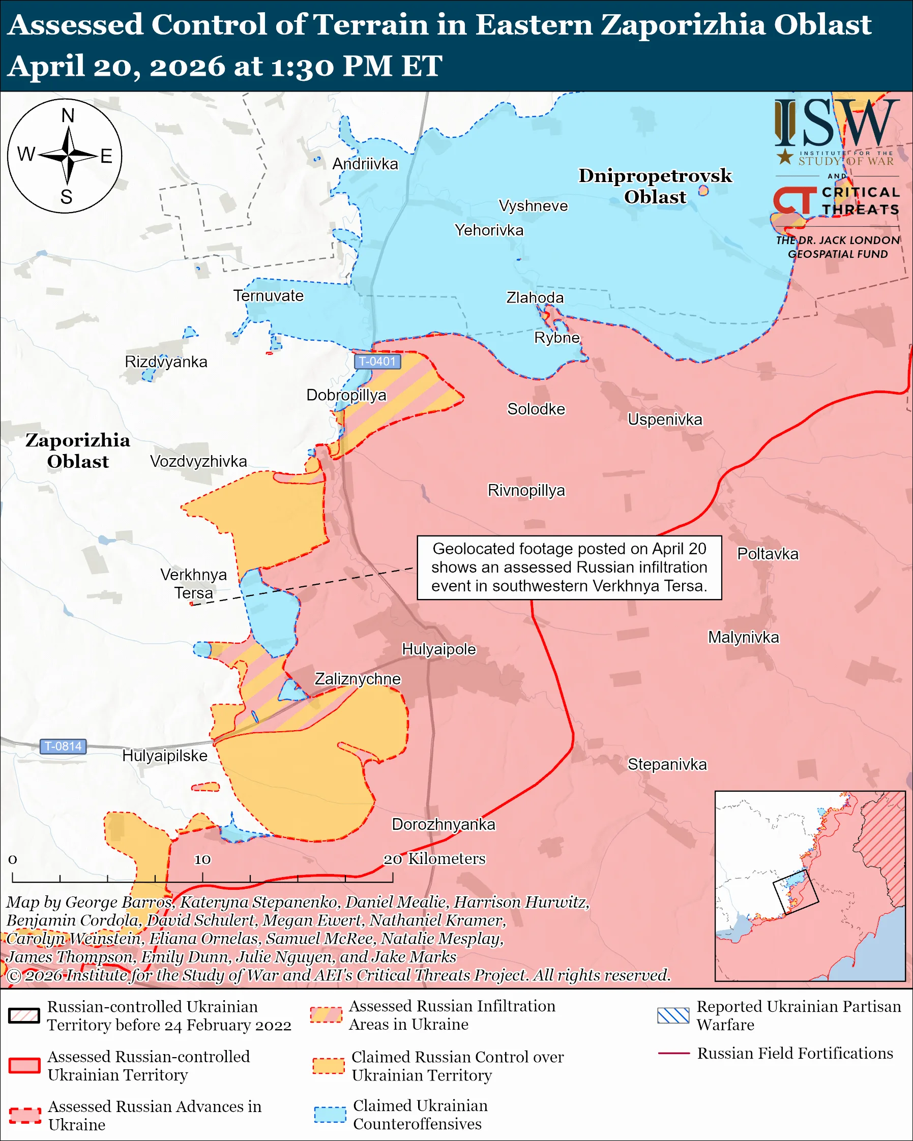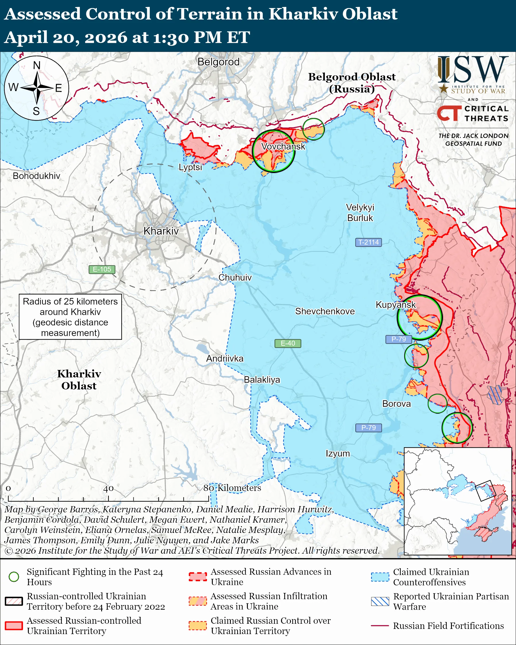 Російські війська продовжують наступальні дії одразу на кількох напрямках, намагаючись, зокрема, створити так звану "буферну зону" вздовж кордону в Сумській області. Водночас, за даними українських військових, ці спроби не мають тактично значущих результатів – противник не просунувся 20 квітня, а його здобутки обмежуються прикордонними селами.