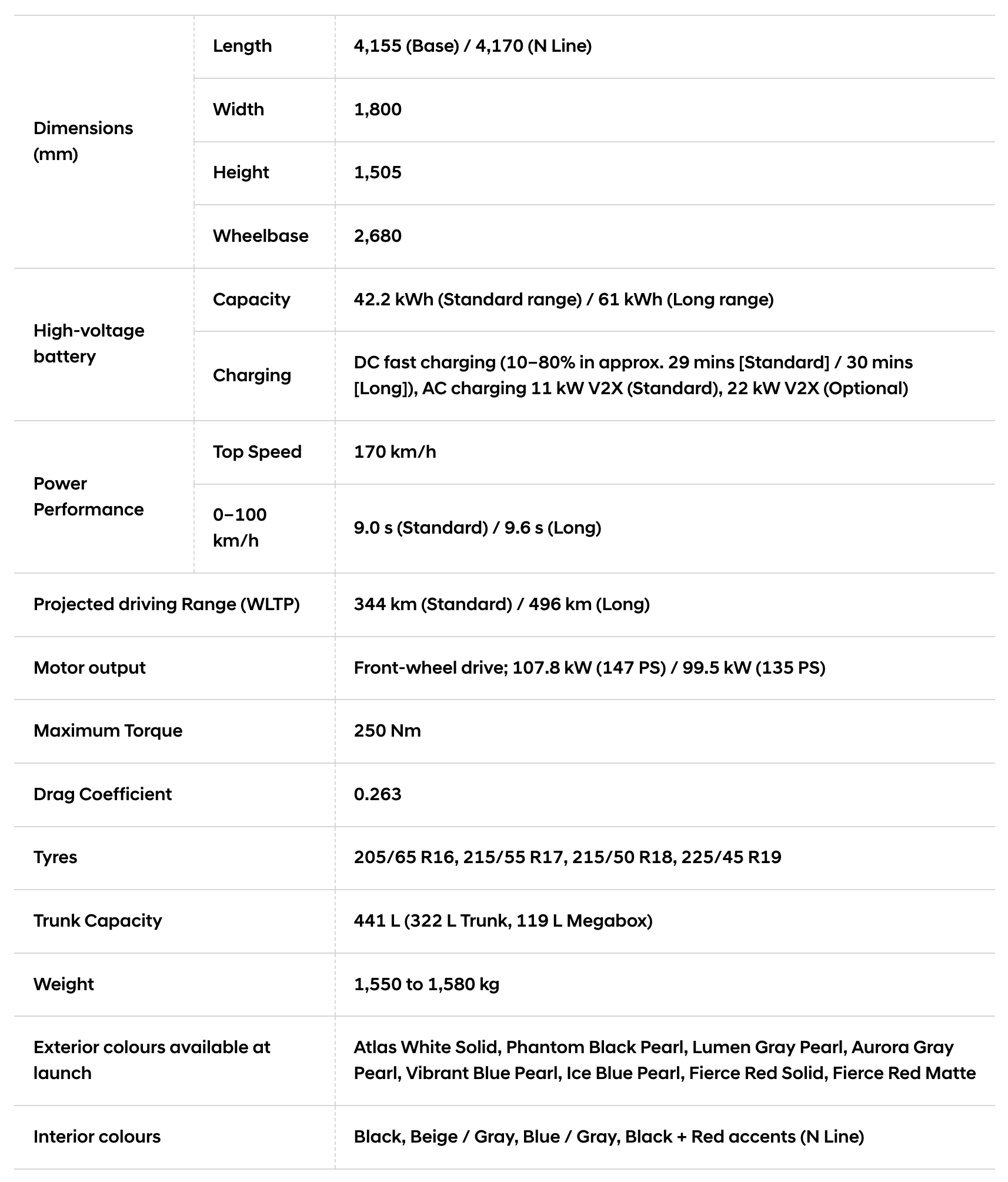 IONIQ 3 has been developed to meet the needs of everyday drivers, young families and innovative customers who value functionality as much as style. Built on Hyundai Motor Group’s Electric-Global Modular Platform (E-GMP) with a 400-volt electrical architecture, the vehicle delivers a balanced combination of efficiency, driving range and charging capability, designed to support everyday comfort and ease of use. Two battery options are available, offering projected WLTP ranges of 344 km (Standard Range) and 496 km (Long Range), allowing customers to choose the setup that best fits their lifestyle.