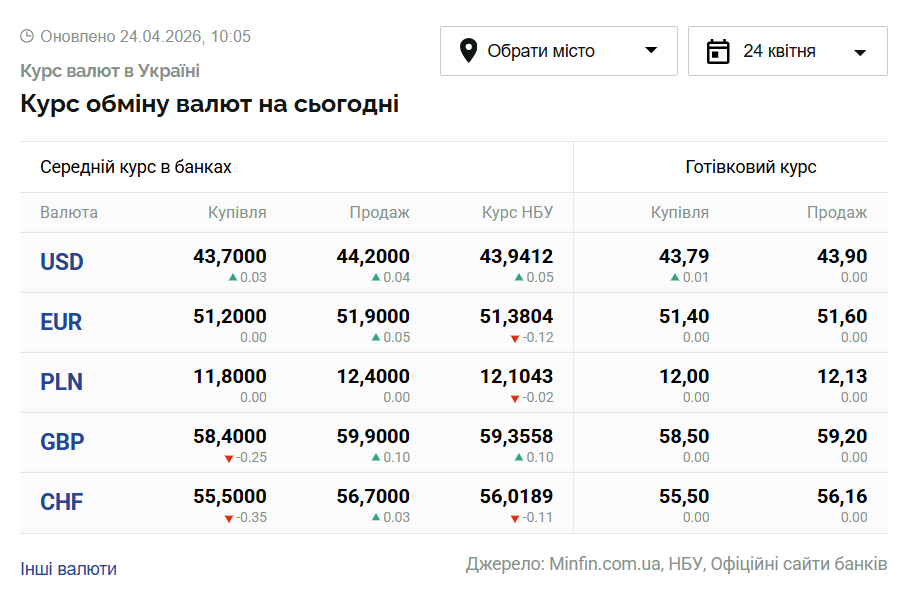- 1 долар США – 43,94 грн (43,88 грн станом на 23 квітня);