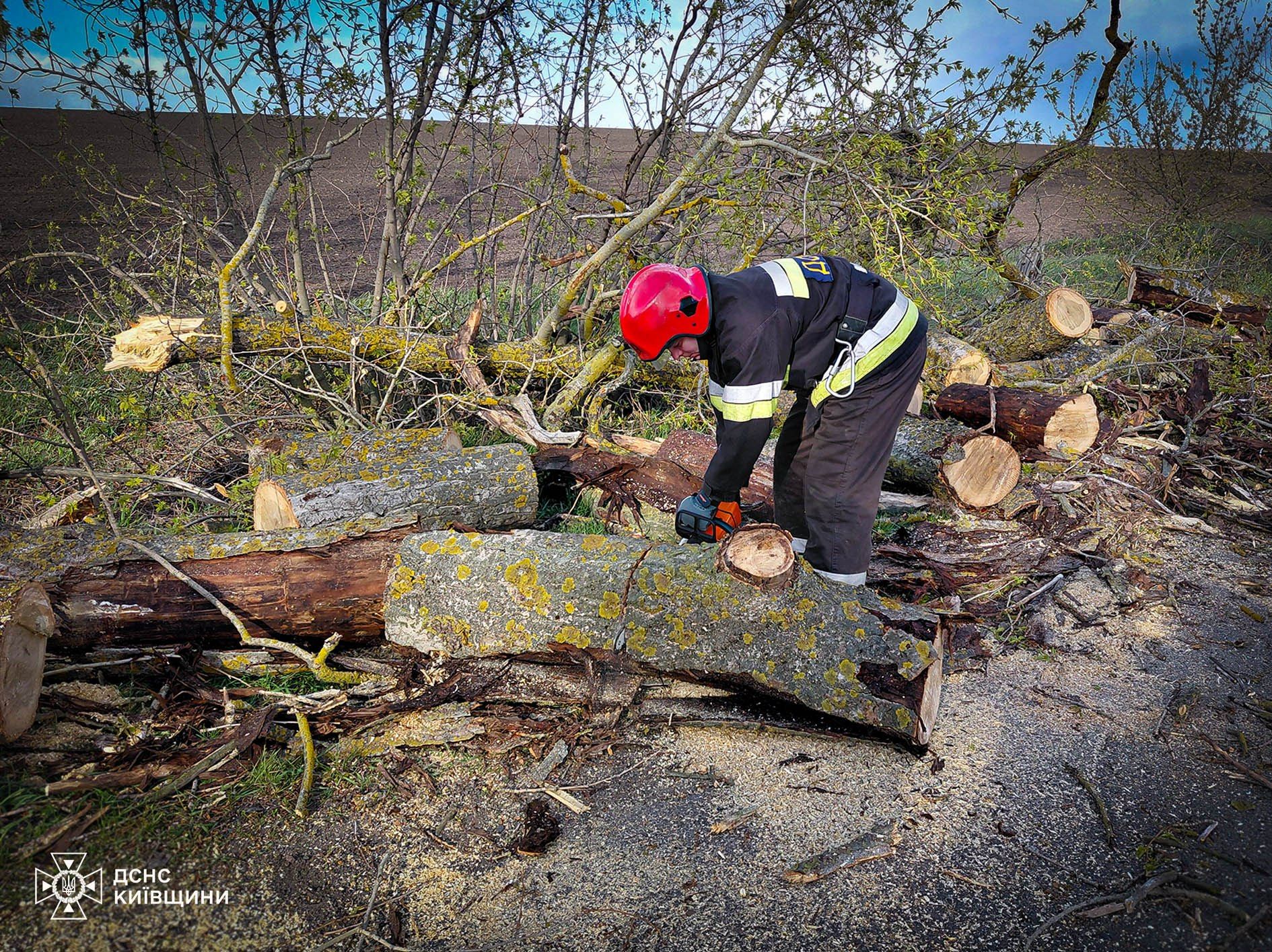 На Київщині внаслідок падіння дерев сталась пожежа та був ускладнений рух транспорту. Ці наслідки негоди також ліквідувала ДСНС.