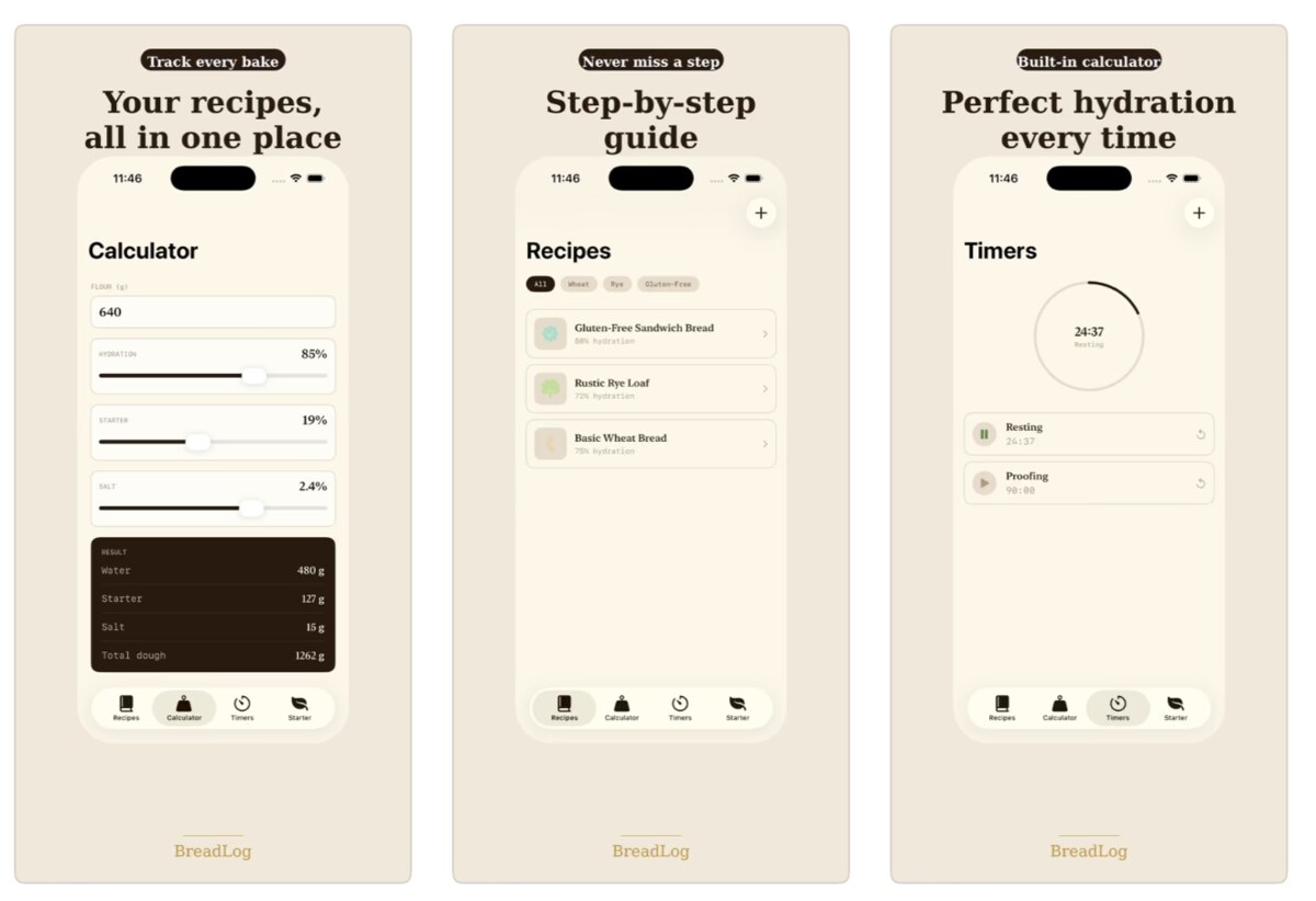 BreadLog орієнтований на любителів домашньої випічки й зокрема соurdough. У застосунку можна зберігати рецепти з інгредієнтами та покроковими інструкціями, користуватися вбудованим калькулятором гідратації тіста, запускати кілька таймерів одночасно для різних етапів випічки та вести щоденник закваски — щоб відстежувати годування і знати, коли стартер готовий до роботи. Усі дані зберігаються локально на пристрої, без акаунтів і реклами.