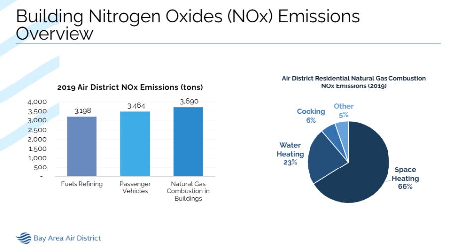 An illustrative example of the harmfulness of this pollution can be seen in the Bay Area Air District (BAAD), which is currently trying to reduce pollution from gas water heaters and furnaces. In BAAD’s presentation at the Advanced Water Heating Initiative’s January 2026 working group, they showed how burning gas in furnaces and water heaters accounts for the largest source of NOx emissions in their territory — even larger than vehicles. Water heating makes up about a quarter of these building-related NOx emissions.