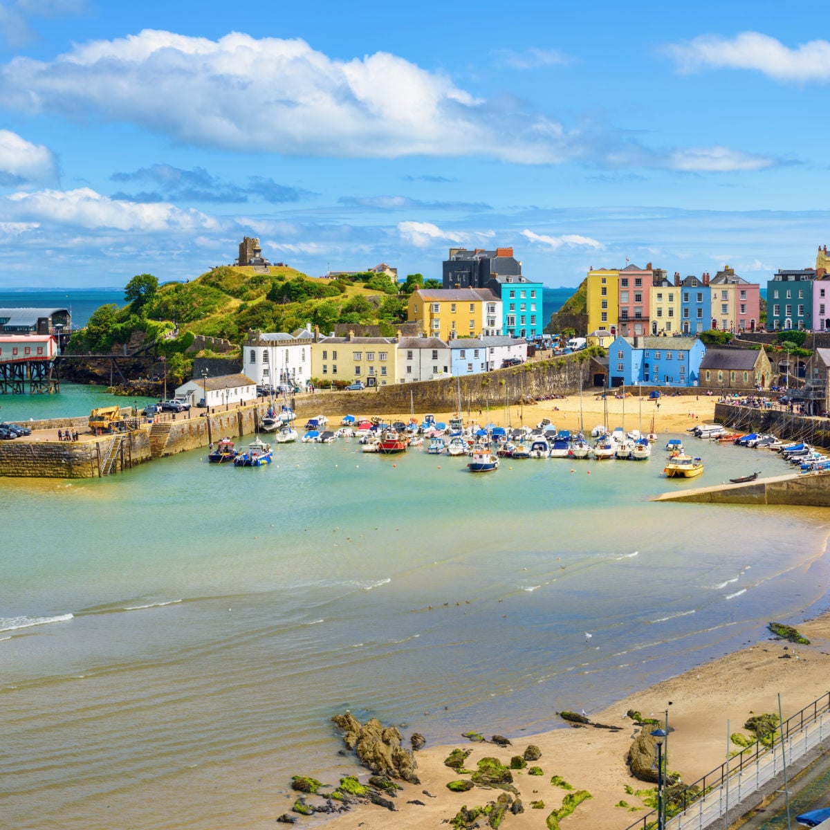Tenby stands out because it’s not just about the beach itself. You get gorgeous sand, the added bonus of a colorful, pastel townscape, and blue waters. It’s easily one of the best all-around beach escapes in Wales, especially unparalleled Castle Beach that lives up to its name.