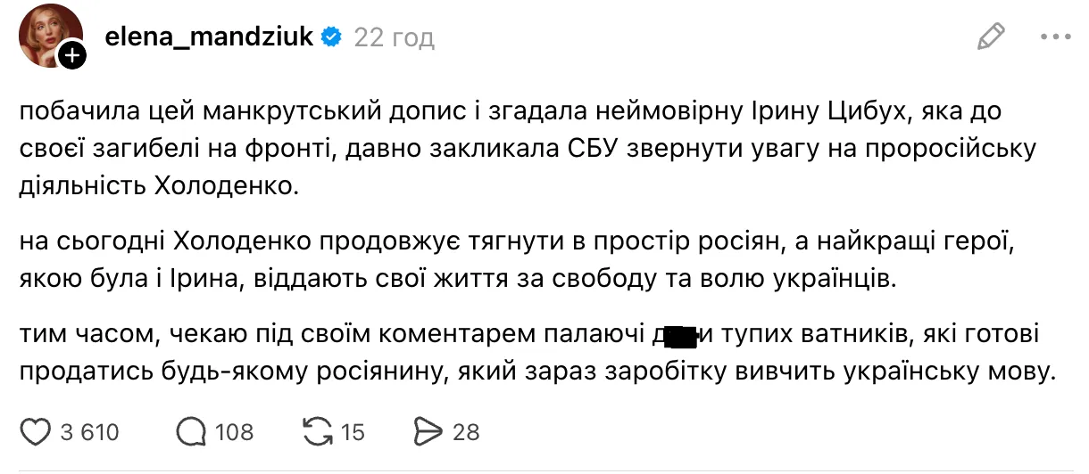 Блогерка Олена Мандзюк розкритикувала Наталію Холоденко і назвала її допис "манкуртським". У своєму коментарі вона згадала парамедикиню Ірину Цибух, яка до загибелі на фронті звертала увагу на проросійську діяльність психологині.