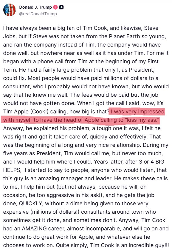 «Коли я отримав дзвінок, я сказав: „Вау, це дзвонить Тім з Apple — це ж неймовірно!“ Я був дуже вражений тим, що керівник Apple дзвонить, щоб „поцілувати мій зад“», — поділився спогадами Дональд Трамп.