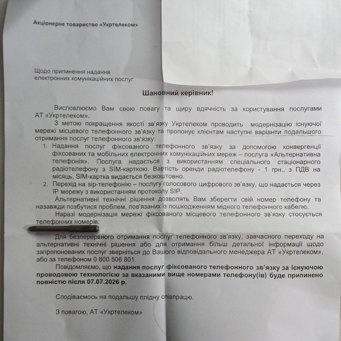 Користувачі повідомляють, що почали отримувати листи від «Домашня телефонія від «Укртелекому» про припинення надання послуг домашнього телефону. Частину номерів відключать від проводової технології вже 7 червня поточного року.